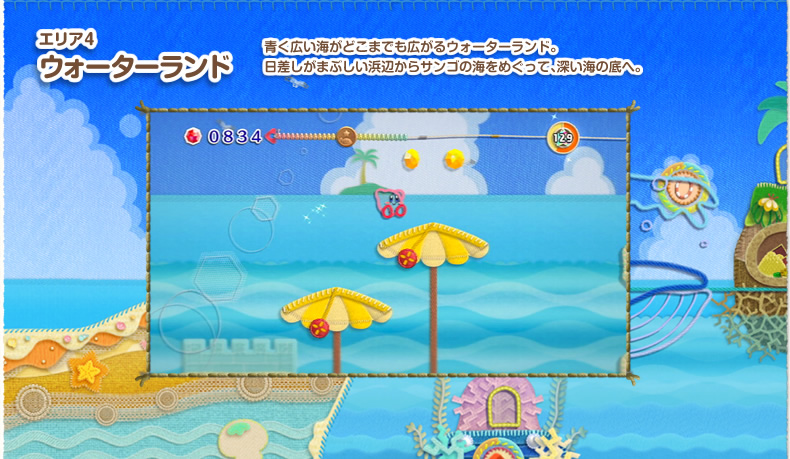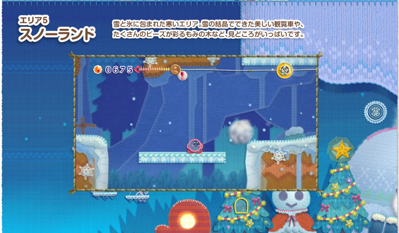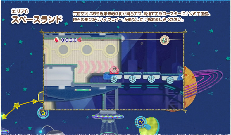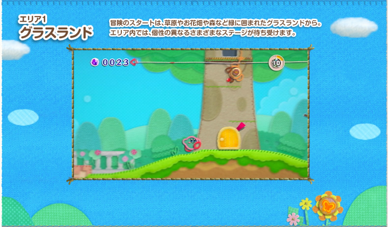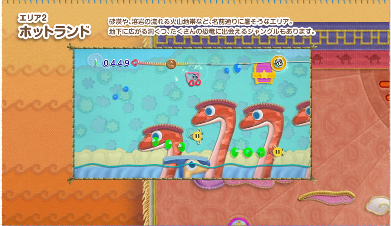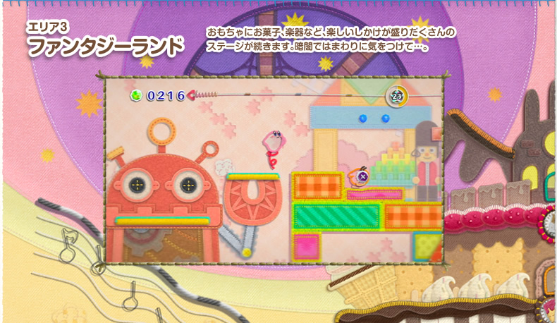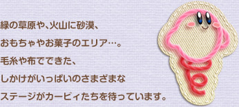 緑の草原や、火山に砂漠、おもちゃやお菓子のエリア…。毛糸や布でできた、しかけがいっぱいのさまざまなステージがカービィたちを待っています。