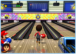 1〜4人用: Wiiリモコンを持って、ボウリングの球を投げるように操作します。 1つのWiiリモコンでも最大4人まで遊ぶことができます。