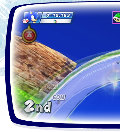 ループしているコースや、ジャンプ台、さまざまなギミックがあるコースで、旗の間を通りながらいかに早くゴールできるかを競います。相手のジャマしたり、スピードアップできるアイテムをアイテムボックスから手に入れたり、大きなジャンプ台でトリックをうまく決めてスピードアップしながら、一番でゴールを目指していきます。