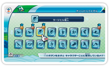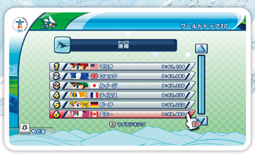 各競技のプレイした記録をみることができます。同じWii本体でプレイしていれば、そのプレイヤーの記録もみることできるので、家族同士で記録を比べて楽しむこともできます。また、ゴーストデータを保存していれば、そのゴーストデータとの対戦も可能です。