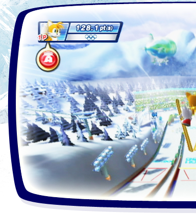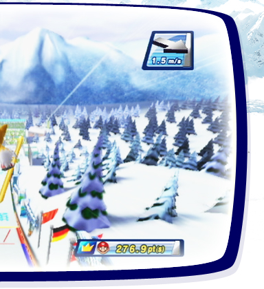 風の向きと強さをみながらスタート。Wiiリモコンとヌンチャクを左右に傾けバランスをとりながら助走、ふみきり地点では上にふってジャンプします。ジャンプ中も上下左右に傾けてバランスをとりながらタイミングをあわせて着地。2回ジャンプして、“飛距離点”と“バランス点”の合計を競っていきます。