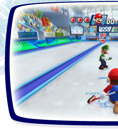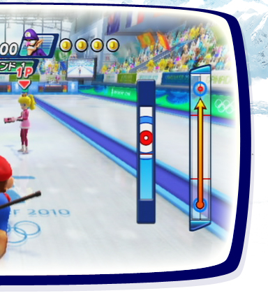 4人1組でストーンとよばれる丸い石を、ハウス(赤と青の円の中心)をねらって投げあっていきます。ストーンは相手のストーンよりもハウスの中心に近いものだけが得点になり、その得点を相手チームと競っていきます。投げる方向を決めて、ボウリングの球を投げるようにWiiリモコンをふってストーンをリリース。Wiiリモコンをふってスウィーピング(ブラシではく)しながら、いきおいを調節していきます。