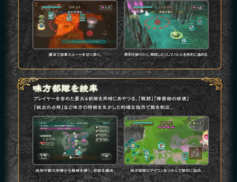 Nintendo - 任天堂ホームページへ Wii - Wii トップページ 魔法で自軍のルートを切り開く。 罠を仕掛けたり、解除したりしてバトルを有利に進める。 味方部隊を統率 プレイヤーを含めた最大4部隊を同時にあやつる。「戦闘」「障害物の破壊」