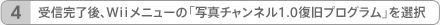 1月31日に発売いたしましたWii用ソフト「大乱闘スマッシュブラザーズX」によるWii本体の更新にともない、「写真チャンネル」が、1.0(MP3形式対応)から1.1(AAC形式対応)にバージョンアップされ、元に戻すことができなくなったお客様より、「写真チャンネルでMP3の音声ファイルが使えなくなった」というご指摘をいただいております。