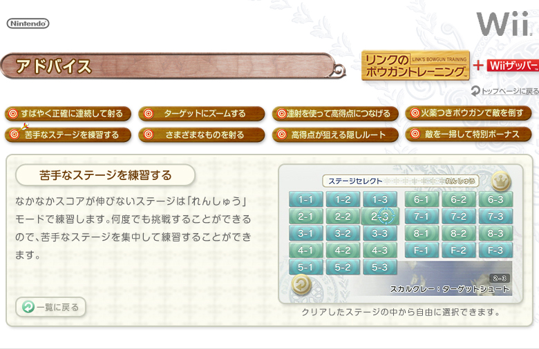 なかなかスコアが伸びないステージは「れんしゅう」モードで練習します。一度プレイしたステージであれば自由に選ぶことができるので、苦手なステージを集中して練習することができます。