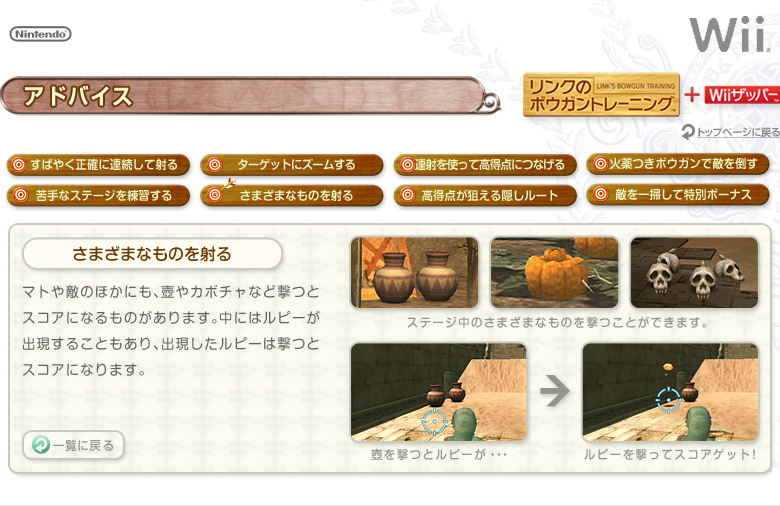 マトや敵のほかにも、カボチャや壺など撃つとスコアになるものがあります。中にはルピーが出現することもあり、出現したルピーは撃つとスコアになります。