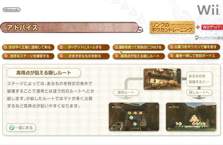 ステージによっては、あるものを特定の条件で破壊することで通常とは違う別のルートへと分岐します。分岐したルートではマトが多く出現するなど高得点が狙いやすくなります。