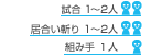 試合 1〜2人 居合い斬り 1〜2人 組み手 1人