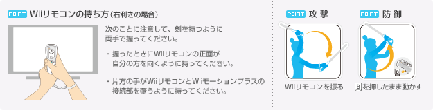 Wiiリモコンの持ち方(右利きの場合)次のことに注意して、剣を持つように両手で握ってください。・握ったときにWiiリモコンの正面が自分の方を向くように持ってください。・片方の手がWiiリモコンとWiiモーションプラスの接続部を覆うように持ってください。 [POINT]攻撃:Wiiリモコンを振る [POINT]防御:Bを押したまま動かす