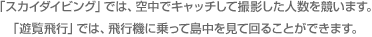 「スカイダイビング」では、空中でキャッチして撮影した人数を競います。 「遊覧飛行」では、飛行機に乗って島中を見て回ることができます。
