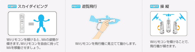 スカイダイビング Wiiリモコンを傾けると、Miiの姿勢が傾きます。Wiiリモコンを自由に持ってMiiを移動させましょう。遊覧飛行 Wiiリモコンを飛行機に見立てて動かします。操 縦 Wiiリモコンを傾けることで、飛行機が傾きます。