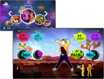 メインモード 好きな曲を選んで踊る、メインのモードです。曲により振り付けの難易度や運動量のレベルが設定されているので、それを目安に曲を選ぶこともできます。最大4人での同時プレイが可能。ふたりのプレイヤーがそれぞれ違う振り付けで踊る「デュエットソング」や、曲を「メドレー」にして踊れるなど、いろんなダンスが楽しめます。