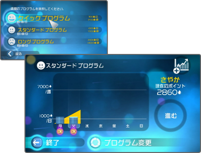 エクササイズモード 踊った運動量を“ダンスポイント”として換算し、日々の運動量をグラフにして管理することができる、運動としてダンスを楽しめるモードです。自分にあった目標を設定し、運動不足の解消に役立てることができます。
