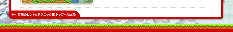 冒険のヒント&テクニック集 トップへ戻る 下へ Nintendo とじる ものがたり&キャラクター マリオのアクション 冒険のしかた コース紹介 2〜4人プレイ