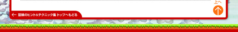 冒険のヒント&テクニック集 トップへ戻る 上へ Nintendo とじる ものがたり&キャラクター マリオのアクション 冒険のしかた コース紹介 2〜4人プレイ