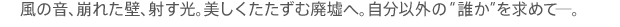 | 舞台はほんの少しだけ先の未来、廃墟になってしまった世界。ひとりぼっちになってしまった少年“セト”は、自分以外の生き残りを探す旅に出る。廃墟に残されたわずかな「人がいた痕跡」を唯一の希望として─。 美しく、儚い廃墟を舞台にした探索RPGが、Wiiで登場。プレイヤーはWiiリモコンを懐中電灯に見立てて操作し、廃墟の中を探索。まるで実際に廃墟の中を探索しているかのような、リアルな感覚を体験できる。 また、物語では、「一期一会の出会い」と「人と人とが共感しあうことの美しさ」をテーマとして描いた、温かいシナリオが展開。心に響く数々の出会いと別れが、一人ぼっちだった少年セトの心を強く成長させていく。 |
