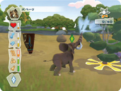 ![]() 動物と仲良くなれば、木をキックして木の実を落とす(シマウマ)、水をかける(ゾウ)など得意技を操作できます。 |