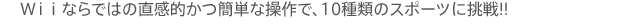 | Wiiリモコンで、ジャンプ!! スマッシュ!! シュート!! Wiiならではの直感的な操作で10種目のスポーツを体感できる、 スポーツパーティーゲームが登場!! 収録されているスポーツは、サッカー、バスケットボールといった人気の球技から、ビーチバレー、アーチェリー、バドミントンなど話題のスポーツ、フィギュアスケート、カーリング、スノーボードクロスといったウィンタースポーツ、さらにはスーパークロス、カートレースといったモータースポーツまで、バラエティー豊かな全10種目。 種目により、最大4人までの対戦&協力プレイが可能なので、家族や友だちとワイワイ盛り上がれます!! |