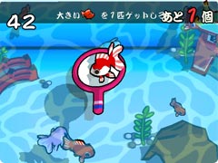 ![]() Wiiリモコンでポイを操作して金魚をすくいます。ポイの膜は左右と真ん中の3箇所使えるぞ! |