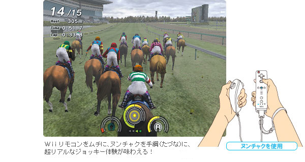 | 『ジーワン ジョッキー Wii』は、Wiiリモコンをムチに、ヌンチャクを手綱(たづな)に模した新感覚の操作により、かつてないほどリアルな騎手体験を実現しています。また、レースシーンの臨場感アップや幼駒育成の導入など、競馬ファンも納得の充実した内容になっております。 プレイヤーは、新人騎手としてデビューし、「ランクのアップ」「重賞勝利」といった比較的達成しやすい目標からスタートします。将来的にはプレイヤーそれぞれが「GI三冠達成」や「短距離重賞総なめ」といった目標を自由に決め、それを達成する楽しみを味わいます。 一歩一歩成長していく過程を実感しながら、全騎手の頂点に君臨するトップジョッキーの座を目指します。 |