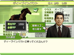 ![]() 馬主からの騎乗依頼。みんなの期待に応え、見事レースに勝利していこう! |
