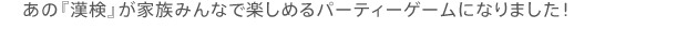 | ニンテンドーDSでヒットした『漢検』がついに“Wii”で登場。 今度はみんなで漢字力対決!最大4人で楽しめる漢字王決定戦は盛り上がること間違いなし!「サイコロを振って問題に答える」だけの誰でもわかるシンプルなすごろくルールを採用し、問題の難易度設定やハンディキャップもつけられるので、子供からご年配の方まで世代を超えた対戦が可能。また、「チャンスカード」、「下克上バトル」など一発逆転が狙える要素も満載なので、大人が子供に勝つとは限らない!? さらに、「送り仮名」や「部首」など大人でも苦戦するバラエティ豊かなミニゲームをはじめ、漢検の過去問題に対応したトレーニングモードなど、1人でも楽しめるコンテンツも満載! |