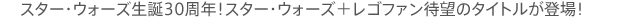 | 『スター・ウォーズ』のエピソードI〜VIのストーリーを完全収録!完全新作ストーリーも追加!圧倒的ボリュームで壮大なスター・ウォーズサーガから「ルーク・スカイウォーカー」、「ダース・ベイダー」、「ハン・ソロ」、「レイア姫」をはじめ人気キャラクター120人以上を収録!なんと、Wiiリモコンでライトセーバーを操れます!! |
