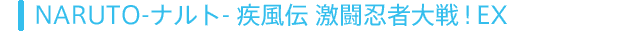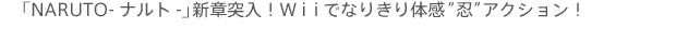 | シリーズ累計130万本突破の超人気シリーズ「激闘忍者大戦!」がWiiの体感アクション要素を加え、大幅に生まれ変わって新登場!しかも舞台は、新章「NARUTO-ナルト- 疾風伝」!!大きく成長したナルトたちが新たな戦いを繰り広げる。 |