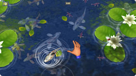 ![]() 池の中を泳ぐ鯉に慎重に狙いを定めて、隙をついて手を伸ばして鯉をつかみ取ろう。 |