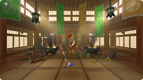 ![]() 師匠が画面の奥から投げてくるさまざまな物をヌンチャクを操って破壊しよう。 |