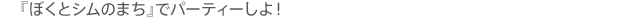 | シムたちともっと遊びたい、そんなキミにピッタリなソフトが登場だよ! シムたちがミニゲームをしゅさいする「フェスタ」が開かれることになった!さあ、シムたちと一緒にパーティーをはじめよう! シムたちがしゅさいするWiiだけのこせいてきなミニゲームがいっぱい!DS版『ぼくとシムのまち パーティー』とはちがうミニゲームが50種類も入ってるよ!Wiiリモコンを4つ使って最大4人まで対戦できるからみんなでもりあがれちゃう! Wi-Fiにつないで、スコアをせかいじゅうの人とランキングできそえたり、クリアするともらえるモニュメントでまちをもりあげることもできるから、やりこみ要素も満載! |