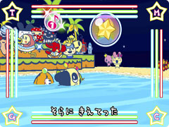 ![]() シンクロステージでは「夏祭り」でダンス!華麗な泳ぎをたまごっち達が披露するよ♪ 画面をポイントして★マークを狙おう! |