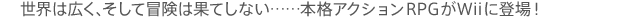 | 最強のカスタマイズ系アクションRPGが遂にWiiで登場します。 広大なフィールドで展開する「リアルタイムアクションバトル」、そして、悠久の地エルダールで紡がれる“絆の物語”をお楽しみください。 また、キャラクターの「育成」、街やダンジョンの「探索」、未知の宝を探し集める「収集」の各要素はシリーズ最大級のボリュームでお届けします。 プレイヤーと一緒に冒険をしてくれる魅力的な「傭兵」たちの存在や、ファイター・ナイトなどの10種以上の「職業」、まだ見ぬ強敵と戦える豊富な「クエスト」、などのさまざまな要素もゲームを盛り上げます。 ニンテンドーWi-Fiコネクションに接続すれば、無料で遠く離れた友だちと「2人協力プレイ」も楽しめます。 |
