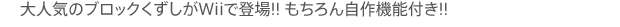 | ブロックくずしがWiiリモコンとヌンチャクで遊びやすくなった!! 4つの楽しいステージに、好みにあわせて自分だけのキャラクターをカスタマイズできる楽しさも加わった。 自作機能を使って、作ったステージを友達と交換しよう。 多彩なギミックとアイテムを使ってブロックを壊したり、破壊力抜群の必殺技を繰り出してハイスコアを目指せ! もちろん、ニンテンドーWi-Fiコネクションを使った対戦プレイでも遊べるぞ!! |