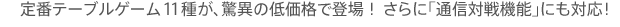 | 定番中の定番であるテーブルゲームが勢揃い! 「麻雀」、「将棋」、「囲碁」、「リバーシ」、「五目並べ」、「こいこい」、「花合わせ」、「大富豪」、「七並べ」、「神経衰弱」、「ソリティア」が1本で遊べます。 CPUの強さも、初心者用の優しいレベルから、熟練者向けの強いレベルまで揃っているため、どなたでも安心してプレイできる! また、ニンテンドーDSを持ち寄れば、手札を隠さなくてはいけないゲームも複数人でプレイできます。 さらに一人プレイでは、CPUキャラクター達と“G”を賭けての真剣勝負も可能! 見事勝利すれば“G”を獲得、家具や壁紙が購入できる。いろいろ購入して、自分好みの部屋にカスタマイズしよう! “G”を稼ぎまくれば、ヒロインとの関係が発展するかも…?" この価格で「通信対戦機能」にも対応!フレンド登録による「お友達との対戦」から、「ランキング」をかけた「全国のプレイヤーとの真剣勝負」とフル対応! お友達同士で、そして全国の猛者たちと対戦しまくろう! |