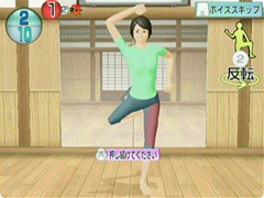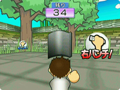 ![]() 「カラテエクササイズ」は、Wiiリモコンにヌンチャクをセットしておこなうエクササイズです。画面に出てくる目標物を指定された方法で破壊していきます。 |