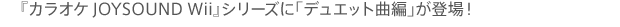 デュエット曲ばかり50曲を収録。まだ『カラオケJOYSOUND Wii』シリーズ(※1)でネット配信されていない、このパッケージでしか歌えない名曲も数多く収録!(※2)