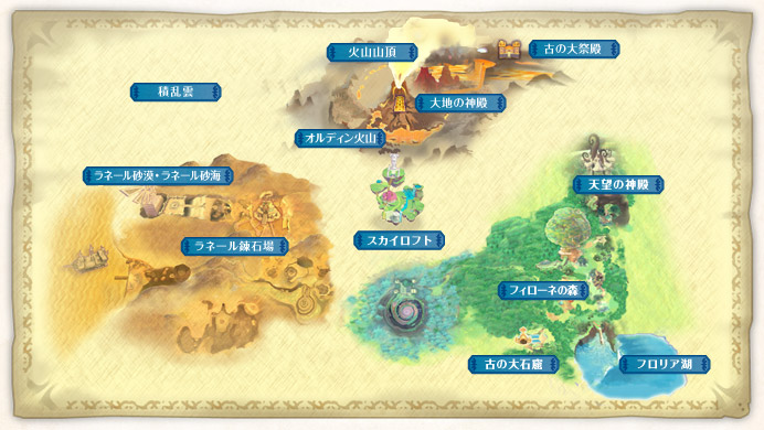 スカイロフト フィローネの森 天望の神殿 フロリア湖 古の大石窟 オルディン火山 大地の神殿 火山山頂 古の大祭殿 ラネール砂漠・ラネール砂海 ラネール錬石場 積乱雲