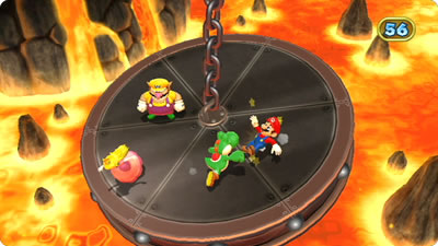 ぐらぐらかたむくフィールドの上でジャンプやパンチ、キックでライバルたちとおとしあい!