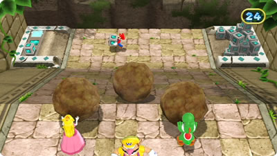 1人は3個のブロックをフィールドの右から左へ、3人は岩を転がしてそれを阻止! 時間内にブロックを移動できるか勝負!