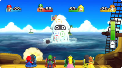 海の上に浮かぶゲッソーを大ほうで狙いうち! ゲッソーはウニラを投げたり、スミをはいたりするので気をつけて!