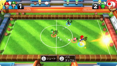 2人vs2人のサッカーゲーム。パスを出したり、シュートをうったり。ライバルのクリボーをぜんぶたおせるか勝負です。