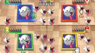 パズルにたりないピースはどれ? 誰がいちばん早く5つのパズルを完成させられるかを競いあいます。
