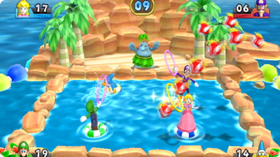 プールに投げ込まれたリングを、ライバルと奪いあい。高得点をゲットできる金のリングがねらい目です。