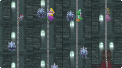 くさりをすべりおりて、いち早くゴールするのは? トゲトゲボールにぶつからないよう、右に左にコントロール!