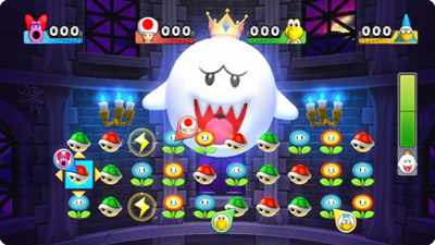 同じ絵を3つつなげてテレサを攻げき。カミナリの絵をそろえると、大ダメージをあたえられます!