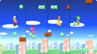 ジャンプブロックを使って、にじのかかった雲のゴールを目指します。冷静さとすばやさが勝負のカギです。