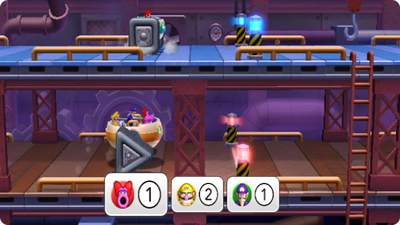 変わったタイヤのクルマを、正しいボタン操作で前進させます。1人側とライバル側、早くゴールするのはどっち?