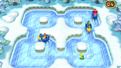 ライバルたちはソリに乗って、1人に体当たり! 1人は制限時間いっぱいにげつづけられたら勝ちです。