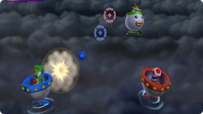空中を飛び回るクッパJr.を大ほうでねらいうち! パートナーと協力して、3回ダメージをあたえられたら勝ちです。
